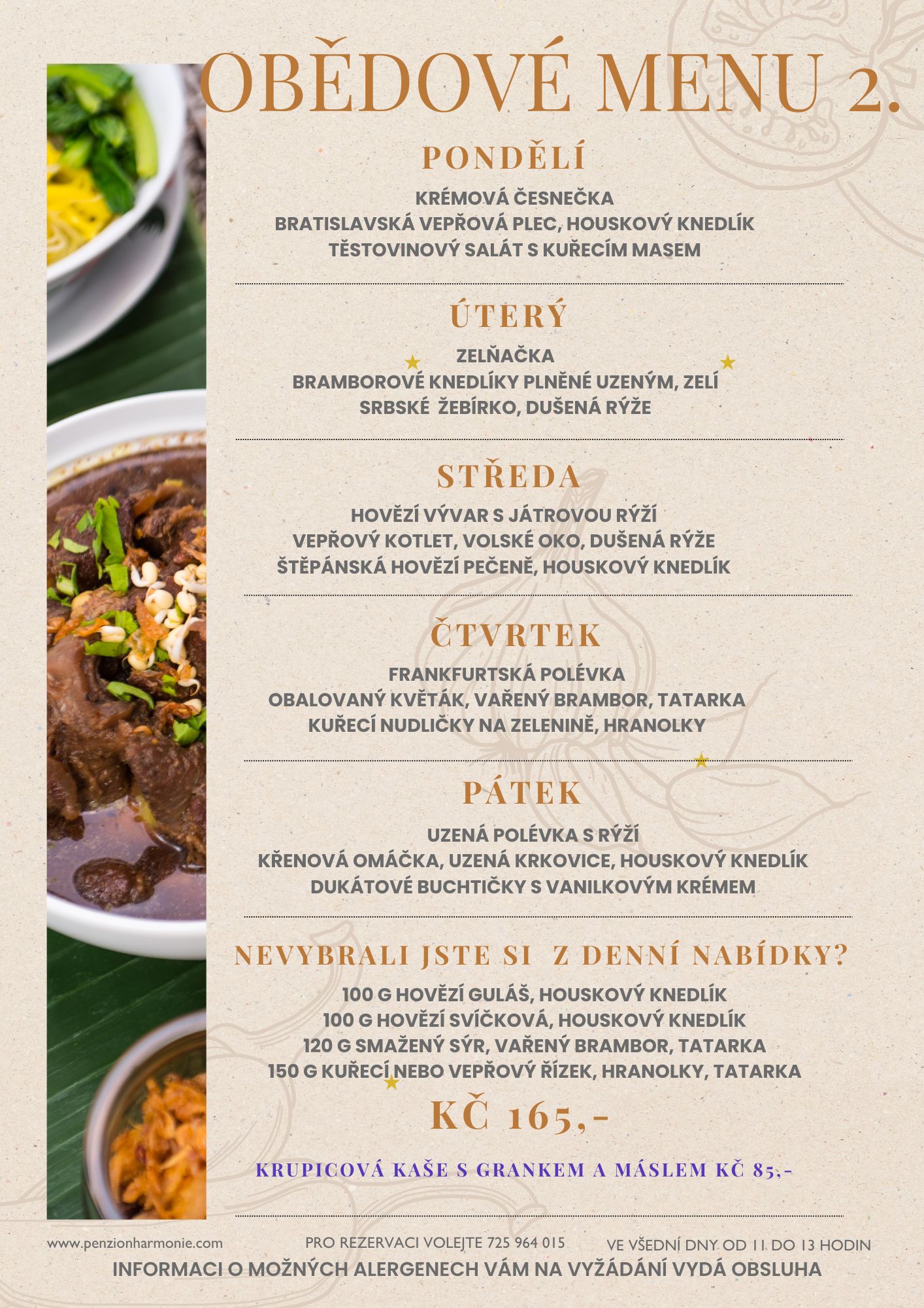 Čekají vás poctivé domácí obědy připravené s láskou. Nabízíme výběr z české klasiky i čerstvých salátů. Za vaši věrnost můžete využít speciální výhody a bonusy.