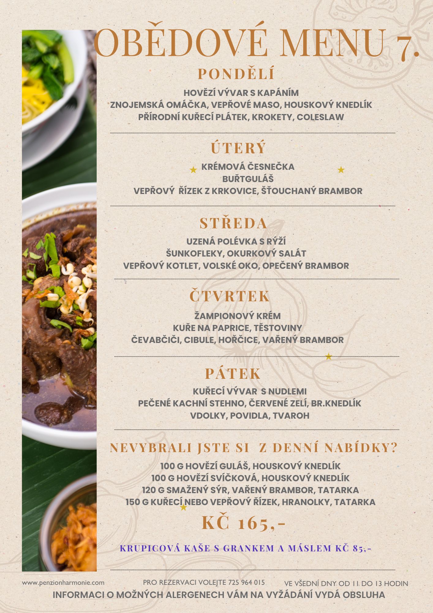 V restauraci jsme pro Vás od pondělí do neděle 11:00 – 22:00 (vaříme do 21:00). Polední menu podáváme od pondělí do pátku.